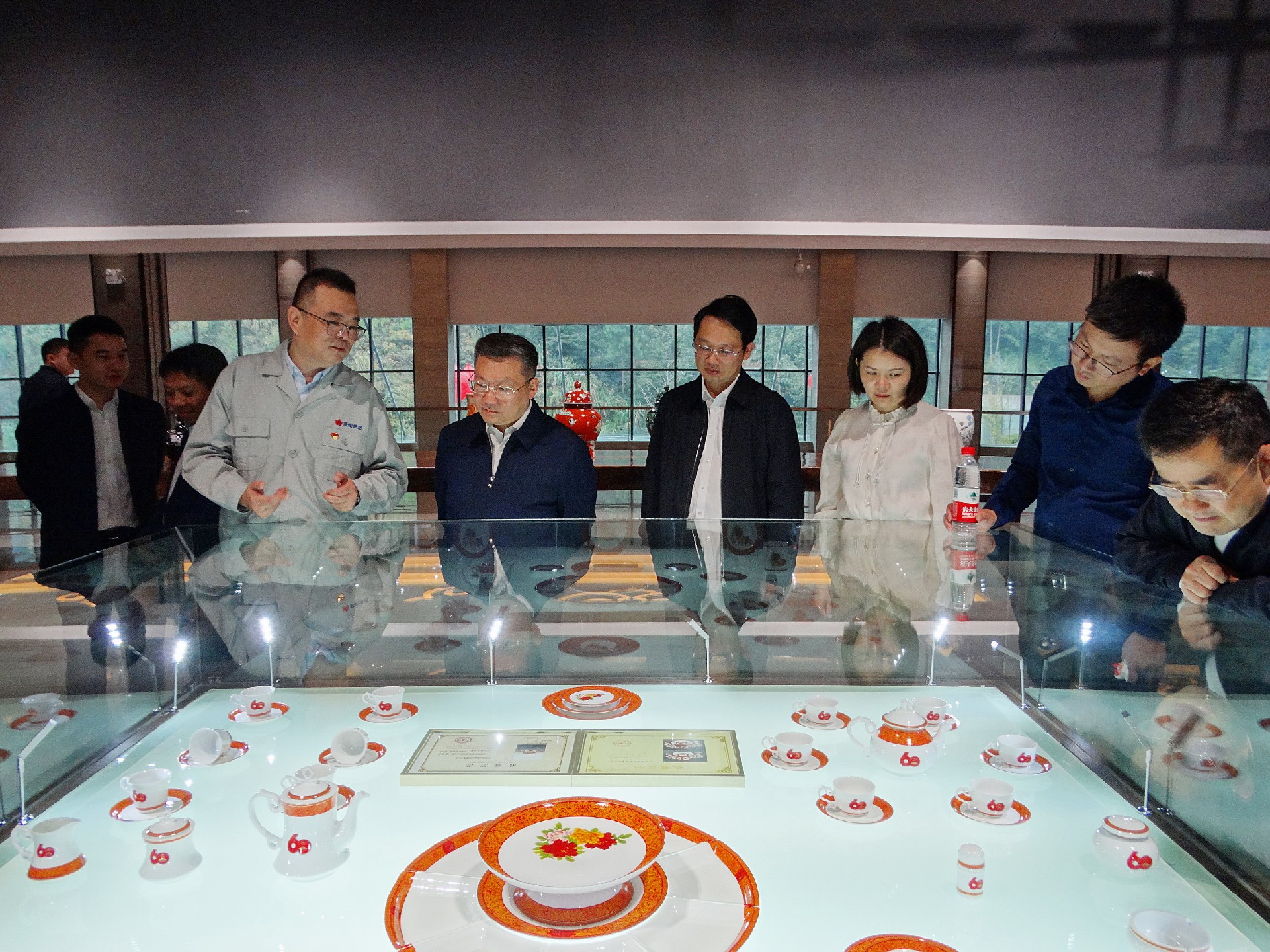 在國(guó)瓷館,胡軼向陳澎一行講解國(guó)瓷館內(nèi)的基本情況和產(chǎn)品特色。大家一路走一路看一路聽(tīng),胡軼向重點(diǎn)介紹了“新中國(guó)成立60周年國(guó)慶慶典天安門觀禮臺(tái)專用瓷”、“‘瀛臺(tái)夜話’接待外國(guó)元首用瓷”、“古典園林”、“首長(zhǎng)專列用瓷”等。一個(gè)個(gè)國(guó)瓷故事和工藝細(xì)節(jié),引得眾人贊嘆不已。陳澎還仔細(xì)詢問(wèn)了企業(yè)生產(chǎn)經(jīng)營(yíng)、對(duì)外貿(mào)易等情況。