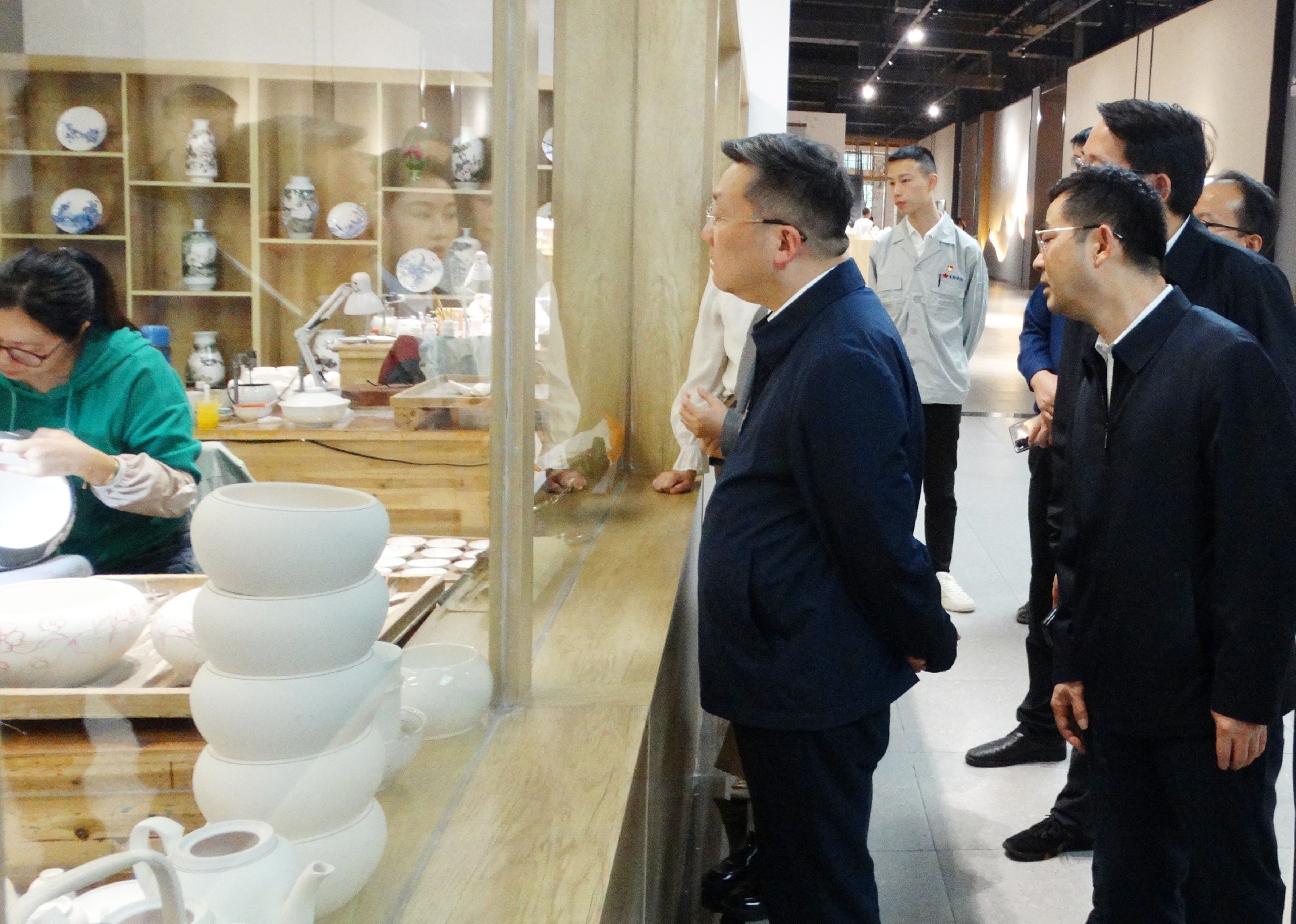 在繪畫展示窗口,工人們正聚精會(huì)神地繪制碗、盤等器皿。陳澎饒有興致地觀看,并連連稱贊她們的技藝,胡軼隨即說(shuō)道,我們集團(tuán)對(duì)專業(yè)技術(shù)人才非常重視,還相繼出臺(tái)了一系列激勵(lì)措施,陳澎聽(tīng)后給予了高度肯定和稱贊。